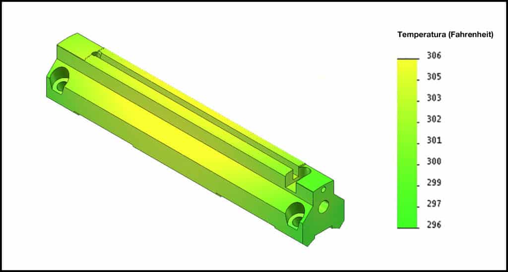 Resultados de pruebas en reseñas termales, ilustradas abajo, claramente muestran la uniformidad del Dura-Therm comparado a la variación de temperatura de mordazas hechas en acero inoxidable:
