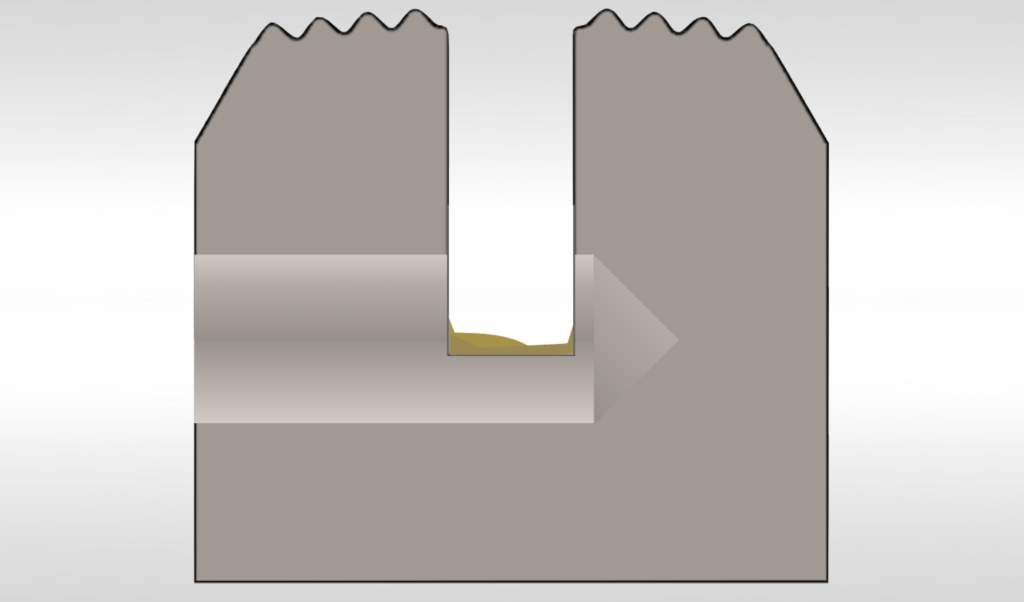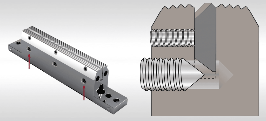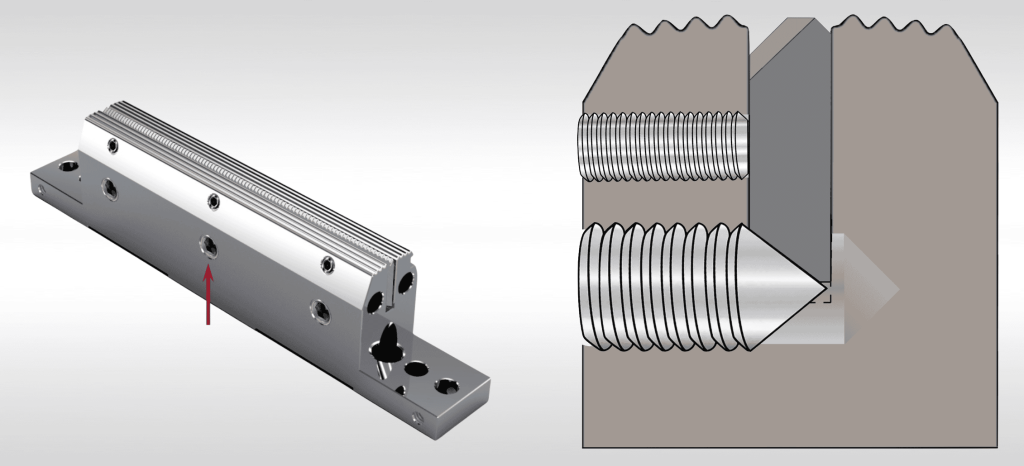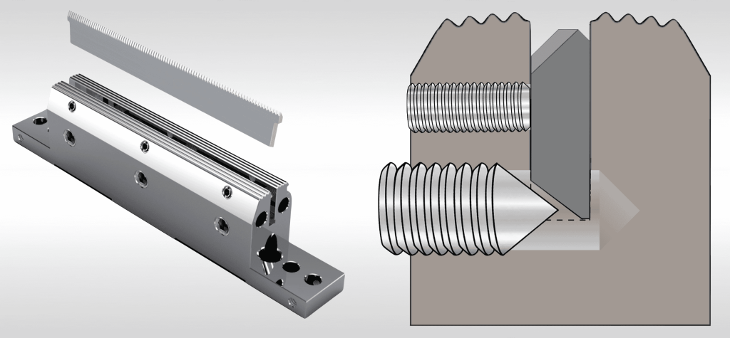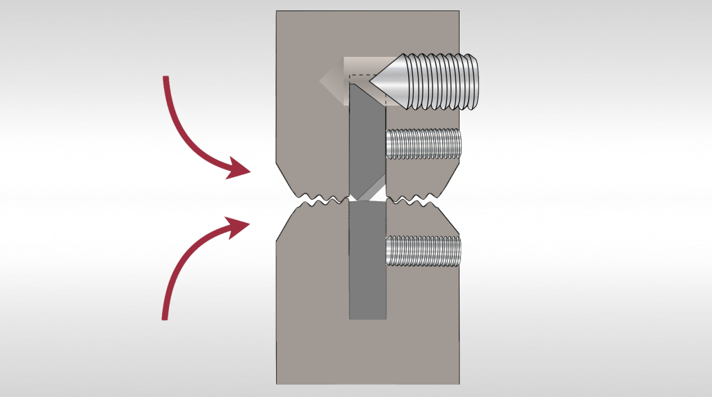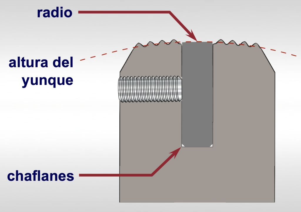 La altura del yunque debe estar comprendida entre la raíz y el punto medio de los dentados. Las mordazas de algunos fabricantes tienen ranuras más profundas que requieren calzas para elevar el yunque hasta este nivel.
