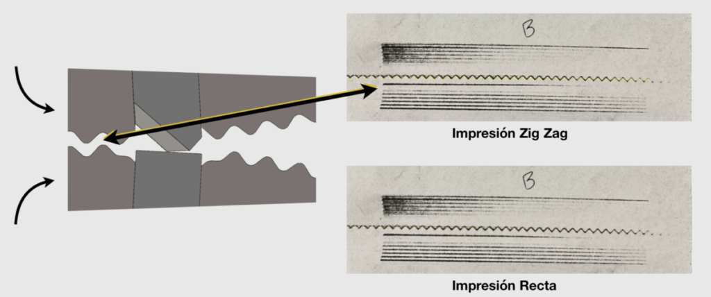 Sin una superficie limpia para cortar, la cuchilla en zigzag tuvo que ser sobreajustada. Esto probablemente provocó que las mordazas, superior e inferior, rebotaran y dejaran el espacio en el sello que aparece en esta impresión justo debajo de la ranura.