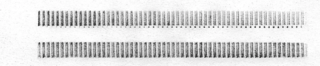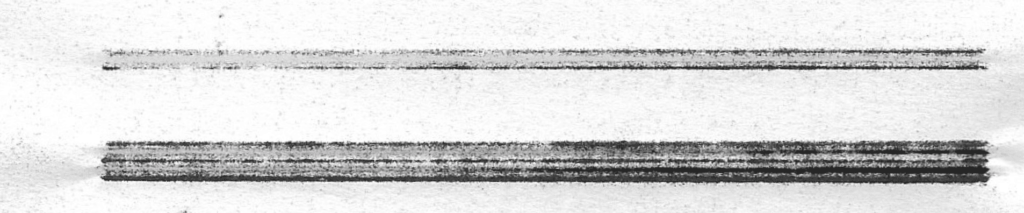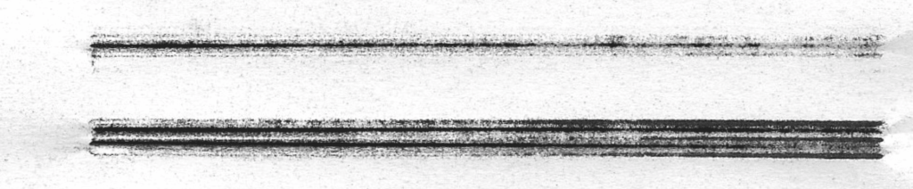La impresión de carbón cuatro es más clara en el extremo izquierdo y más oscura en el derecho, indicando que la distancia entre centros de los ejes no es paralelo y necesita un ligero ajuste.