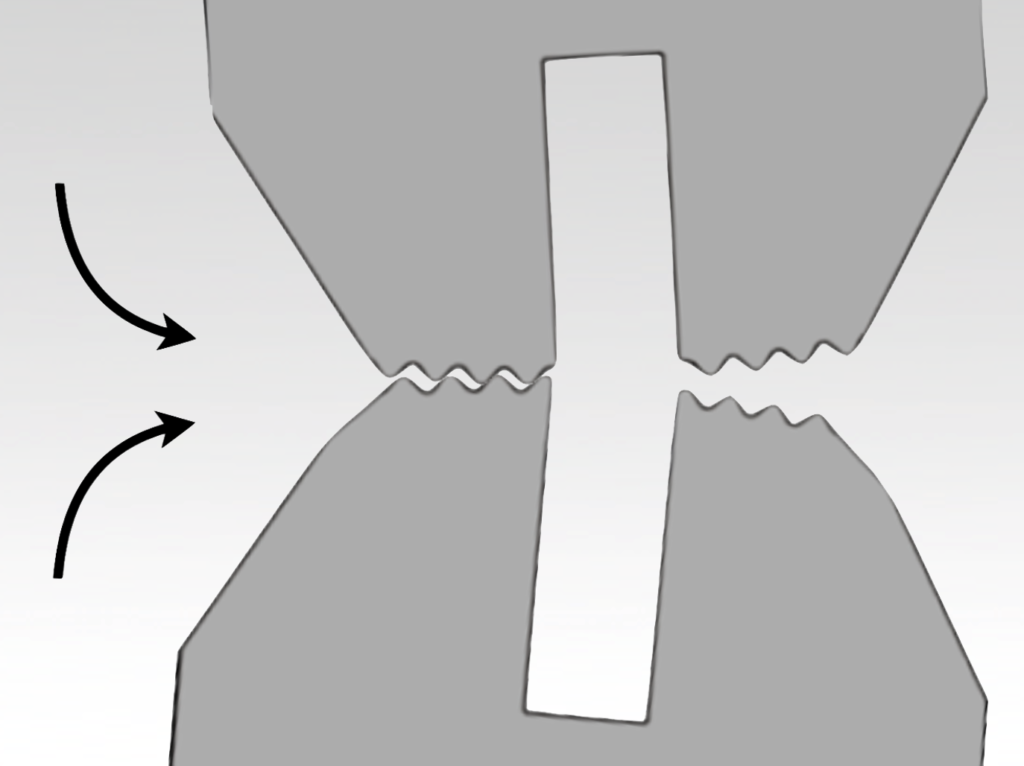 Las líneas horizontales oscuras muestran que los dientes no encajan completamente y se golpean entre sí en lados opuestos. En esta vista, de izquierda a derecha, las estrías golpean con más fuerza en la parte inferior, producen una leve impresión en el medio y golpean con más fuerza en la parte superior.