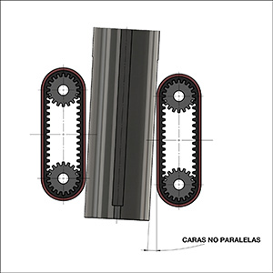 Con la desalineación de lado-a-lado una banda de tracción aplica menor presión que la otra, y el material de envoltura, al deslizarse hacia abajo en el tubo formador, crea tensión desigual en cada lado. Las bandas se desgastan prematuramente incrementando el costo relacionado al recambio de piezas y tiempo muerto. Este desalineo también puede causar que el material de envoltura pierda contacto con el cuello formador en uno de sus lados creando pequeñas arrugas horizontales en la bolsa terminada que reducen la buena apariencia en anaquel y pudiera comprometer la integridad de la barrera contra gases que ofrece la estructura de la película.