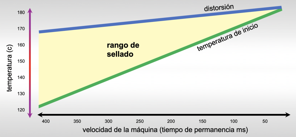 Se crea un Gráfico de Rango de Sellado para determinar las temperaturas y velocidades de máquina óptimas para el material. El rango de sellado puede utilizarse para identificar posibles modificaciones en la estructura que podrían aumentar la productividad o reducir los costos de material.