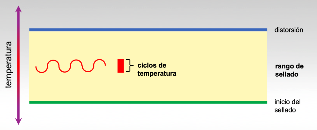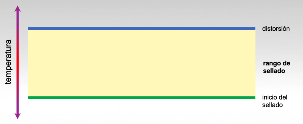 El rango de sellado de un material se define como la diferencia entre la temperatura de inicio del sellado y la temperatura de distorsión.