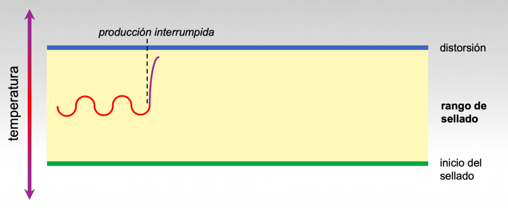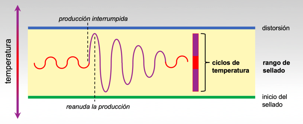 Un rango de sellado adecuado debe permitir ciclos de temperatura de la mordaza de sellado que incluyan el impacto de las interrupciones de producción.