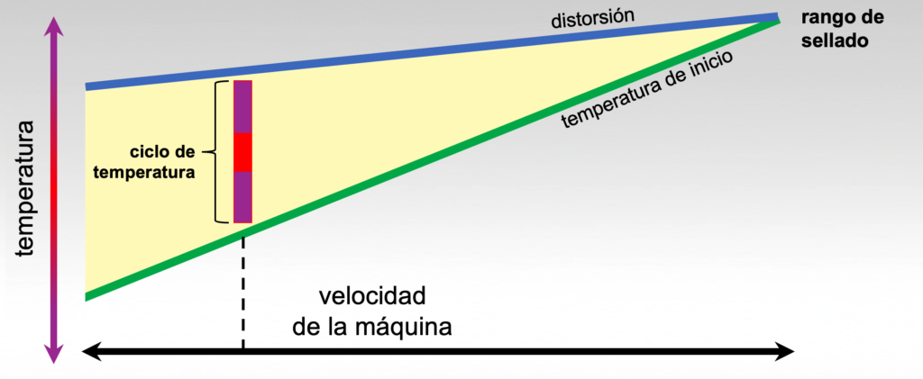 El rango efectivo de sellado se reduce a medida que aumenta la velocidad de la máquina y se reduce el tiempo del sello. Cuando el calor que llega a la capa selladora no logra alcanzar la temperatura de inicio del sellado, los aumentos de temperatura de compensación están limitados por la temperatura de distorsión de las capas centrales de material.