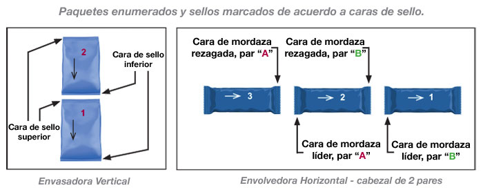 Comienza recolectando una serie de paquetes producidos por la maquina durante condiciones de producción. Numera los paquetes secuencialmente y marca el flujo y dirección de la maquina. Si estas trabajando en una Envolvedora Horizontal con múltiples mordazas, marca cada par (Ej: A, B) y marca cada sello acorde al juego de mordazas del cual proviene. Ahora puedes rastrear el problema en el sello de vuelta al punto donde ocurre.
