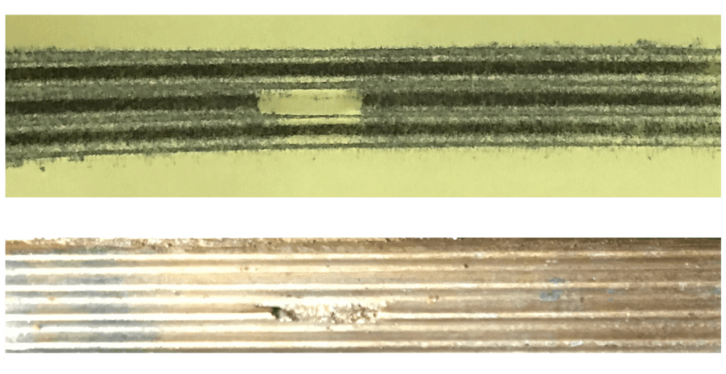 Impressions also help you discover and assess sealing jaw damage. This carbonless impression exposed a significant weak spot caused by damage and confirmed that the jaws needed to be replaced.
