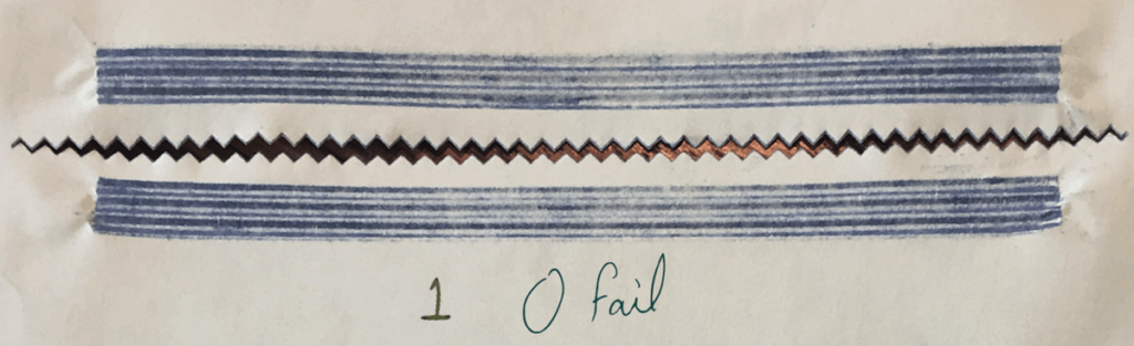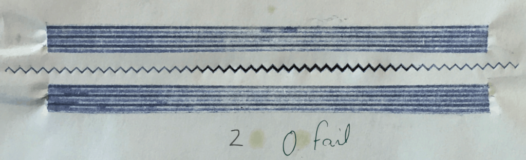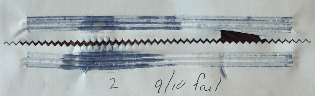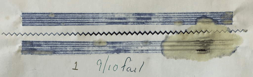 This next impression was made by reciprocating jaws on a vertical bagger. It shows uneven pressure on the upper and lower seals.