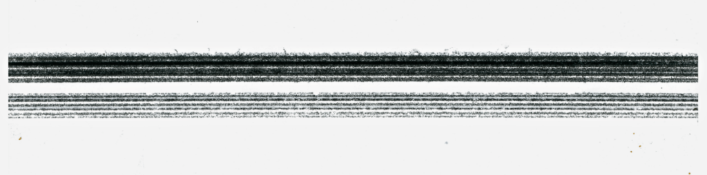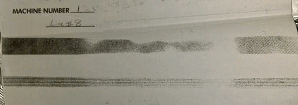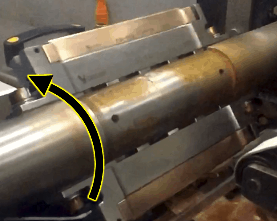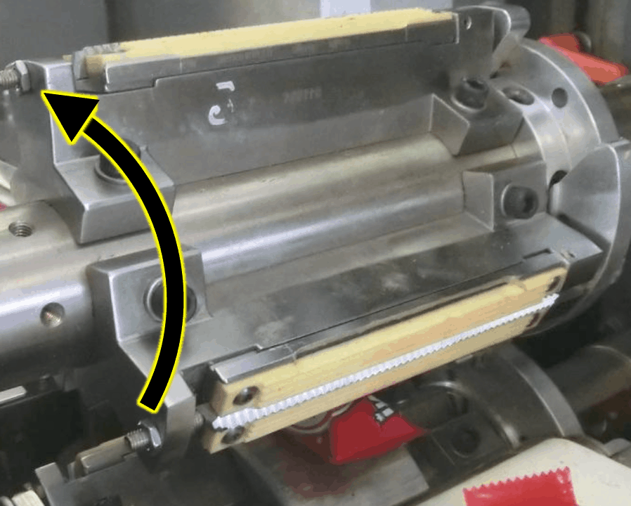 This carbonless paper impression clearly shows the wear on rotary jaws from a flow wrapper.