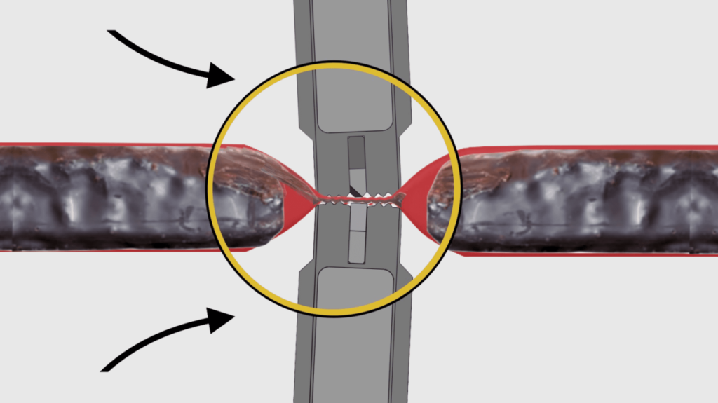 Sealing Jaws – He discovered that the serration pattern on the sealing jaws, which was the same on all wrappers, was too sharp. It was difficult to apply adequate sealing pressure without splitting the film. Reducing spring pressure to eliminate splits often caused poor seal quality. The serration design, he determined, must be updated to solve this problem.