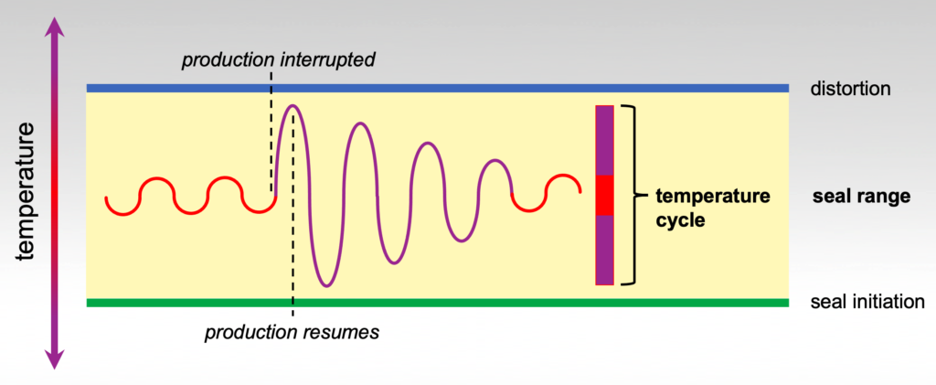 The seal range for your packaging material and conditions spans between the seal initiation temperature and the distortion temperature. The seal range must allow for sealing jaw temperature cycles as the jaws transfer heat to the package and then recover, and for wider temperature cycles when production slows down or is interrupted.