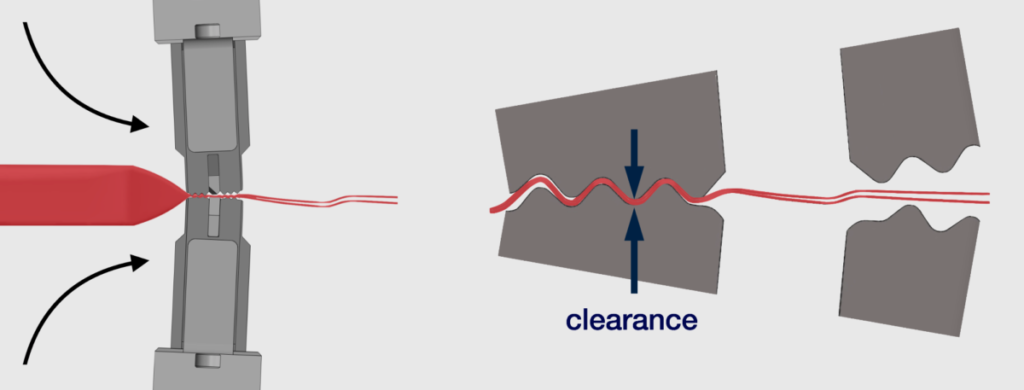 Clearance is the narrow gap or space between the upper and lower sealing jaw serrations. It should be adjusted when the jaws are set up—before knives and anvils are installed—and be just wide enough to create an interference fit for a double thickness of film.