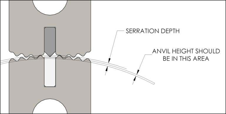 - To avoid damaging the crimpers and to optimize knife and anvil longevity, the anvil should be installed so that the working surface is at or slightly below the midpoint between the root and the crown of the serrations. The knife should then be adjusted out to cut.