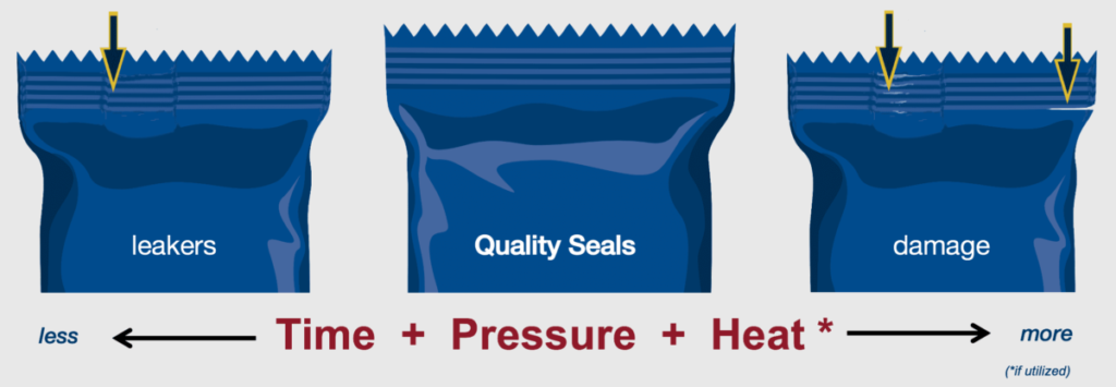 Quality seals on flow wrappers & vertical baggers require a combination of time, pressure, and heat, if utilized, that seals across varying thicknesses created by the fin or lap seal, gussets, or other pleats and wrinkles.
