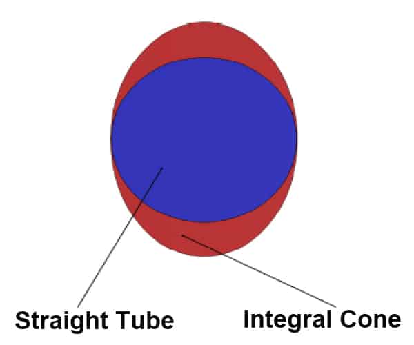 The image at right, with a view looking from above down into the forming tube, shows the larger surface area in the transition zone of an integral cone (red), compared to the smaller surface area in a straight tube (blue). High cut tubes provide an even larger transition zone.