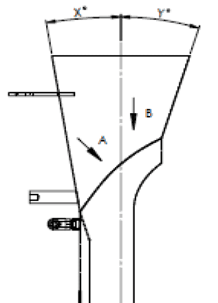 As illustrated below, on Integral Cones and High Cut Tubes the angle at the front (X°) is steeper than at the back (Y°), so that X° < Y°. These designs stagger the charge and help keep it from slowing down and stringing out as it moves through the bottleneck.