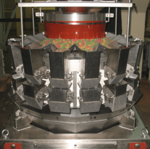 Finished product is conveyed into a scale, auger, counter, or other measuring system, which produces individual “charges” of product—enough to fill one package. Multihead weighers and counters combine product from multiple buckets in order to more quickly create a single, more accurately measured charge.