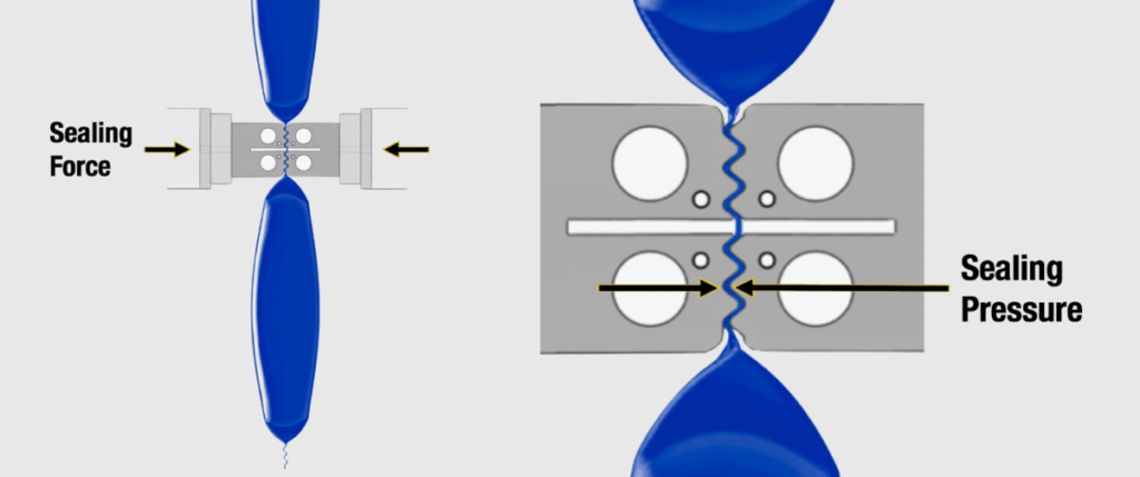 During production, the packaging machine applies force to the sealing jaws. The jaws distribute sealing pressure across the sealing face to create a seal. The amount of sealing pressure applied depends on the total surface area of the sealing face and the serration design.