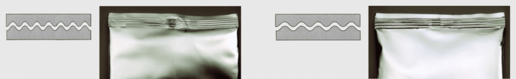 The serrations should minimize or eliminate gaps where little or no force is directly applied, but must also minimize pinch points with excess pressure that can damage or split the film. These issues can become more pronounced when sealing pressure is increased.