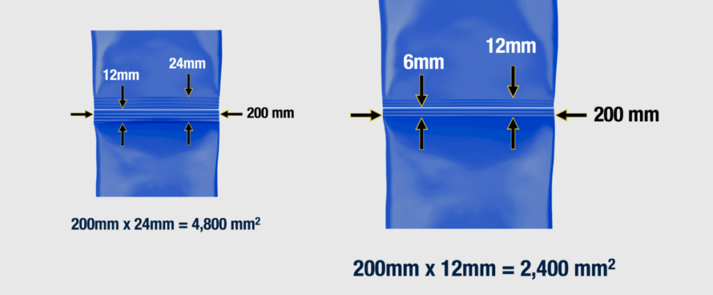 On a 200 millimeter wide package with a 24 millimeter total seal width, the sealing force is distributed across 4,800 square millimeters. If the total seal width is reduced to 12 millimeters, then the sealing pressure is concentrated into 2,400 square millimeters. The same force is now distributed across half of the previous surface area, so each point along the seal receives twice as much sealing pressure.