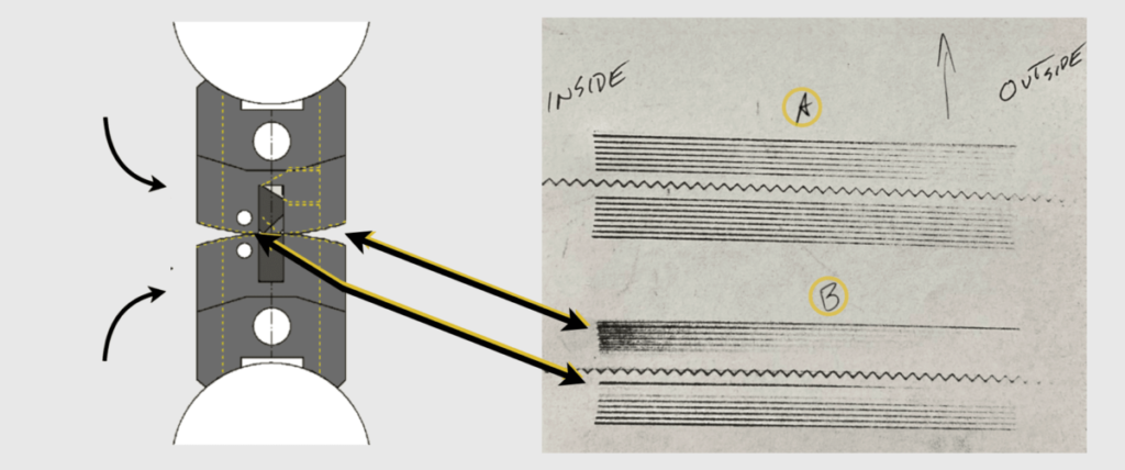 Both pairs of jaws are also misaligned. The serrations only engage at narrow pressure points, displayed as distinct lines on the carbon impression.