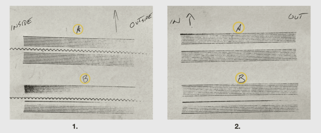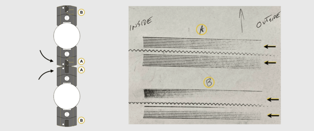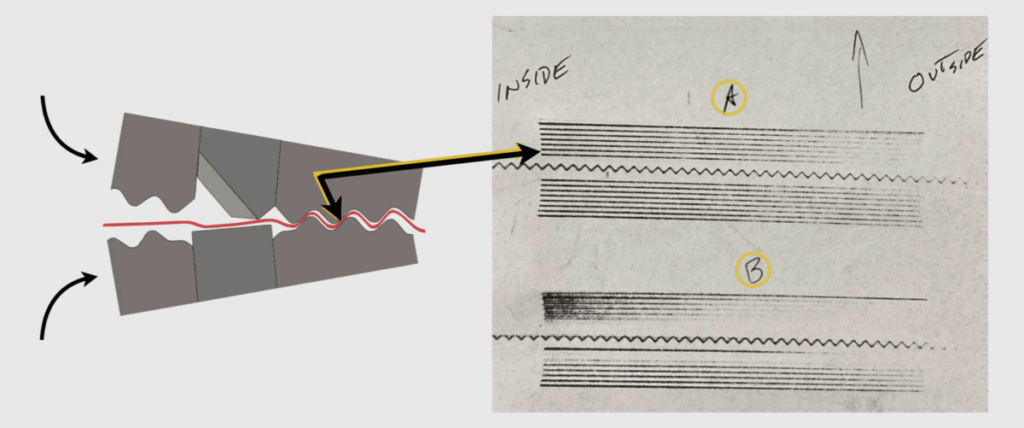 The carbon for pair B shows two knife impressions, indicating a cutting issue that could be causing seal problems. A zig zag impression was made by the currently installed knife. The lighter straight impression was produced by a score mark in the anvil from a previously used straight knife. The anvil had not been changed when the new zig zag knife was set up.