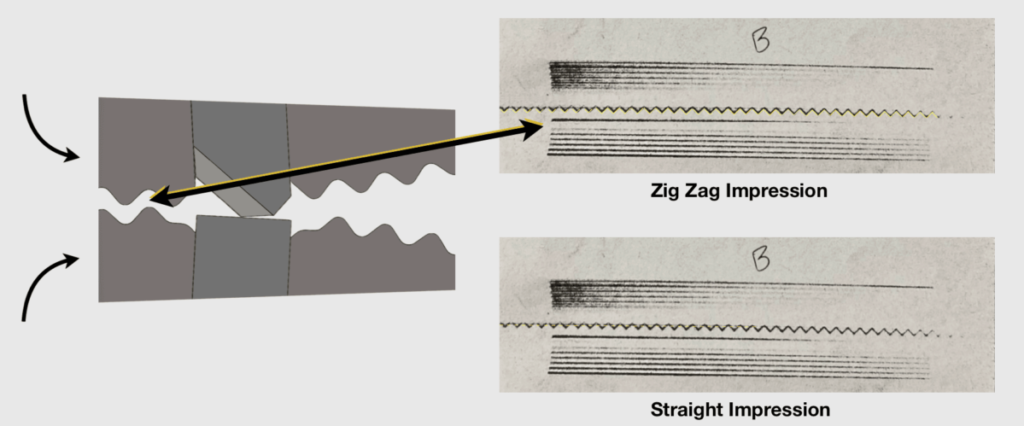 Without a clean surface to cut against, the zig zag knife had to be over-adjusted. This likely caused the upper and lower jaws to bounce apart and leave the gap in the end seal that appears on these impressions just below the slot.