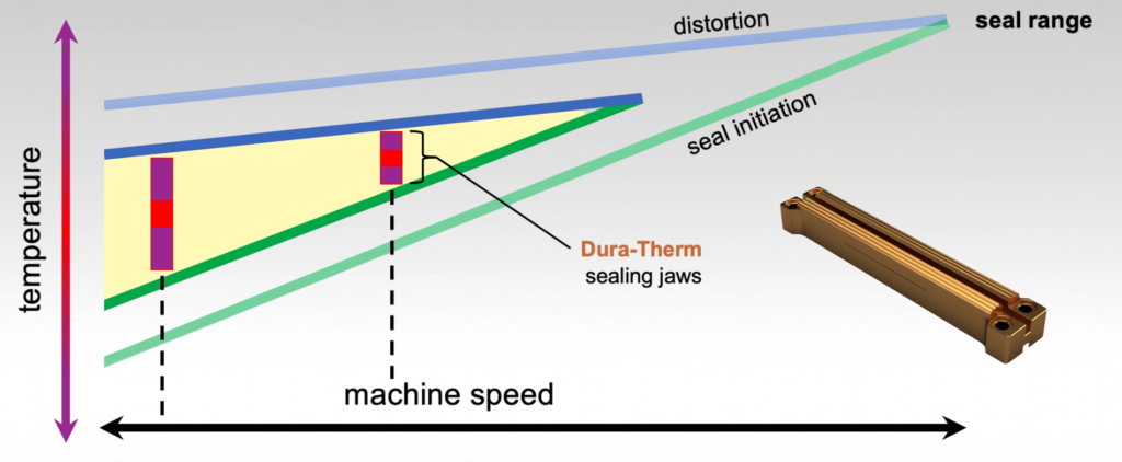 With sealing jaw temperature increases limited by the lower distortion point, reductions to machine speed may be necessary to provide adequate dwell time for seal initiation.