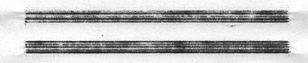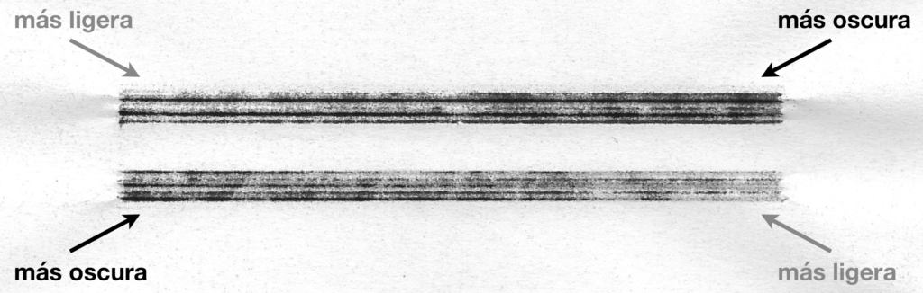 La impresión de carbón cuatro es más clara en el extremo izquierdo y más oscura en el derecho, indicando que la distancia entre centros de los ejes no es paralelo y necesita un ligero ajuste.