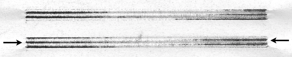 Cuando las mordazas con dientes verticales están desplazadas de la línea central, los anchos del sello en una impresión de carbono suelen ser más consistentes. Pero, como muestra este ejemplo, la impresión de un sello seguirá siendo más débil que la del otro.