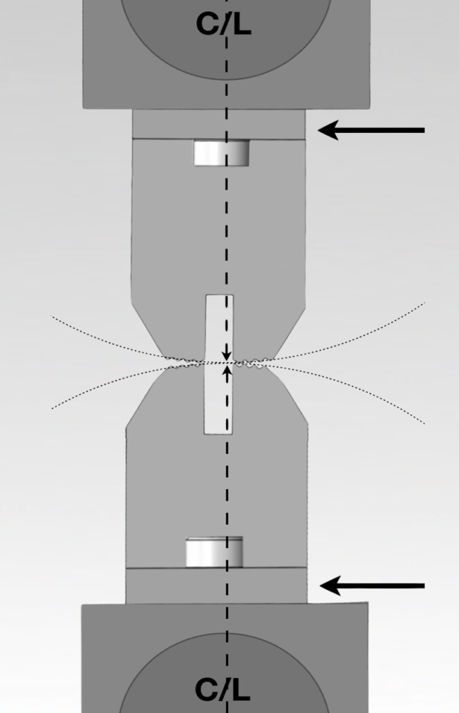 Las líneas horizontales oscuras muestran que los dientes no encajan completamente y se golpean entre sí en lados opuestos. En esta vista, de izquierda a derecha, las estrías golpean con más fuerza en la parte inferior, producen una leve impresión en el medio y golpean con más fuerza en la parte superior.
