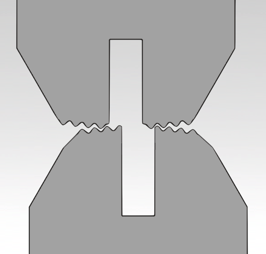 En nuestro primer ejemplo, la impresión es consistente de un extremo a otro y en ambos lados de la ranura, pero desigual en los picos y valles de cada dentado.