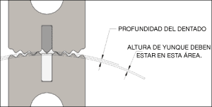 - Para evitar dañar las mordazas y para optimizar la longevidad de la cuchilla y yunque, éste ultimo debe de ser instalado de tal manera que la superficie de trabajo se encuentre ubicado a la mitad, entre la raíz y la cresta del dentado, o ligeramente debajo de este punto.