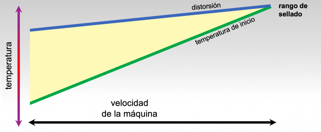 El rango efectivo de sellado se reduce a medida que aumenta la velocidad de la máquina y se reduce el tiempo del sello. Cuando el calor que llega a la capa selladora no logra alcanzar la temperatura de inicio del sellado, los aumentos de temperatura de compensación están limitados por la temperatura de distorsión de las capas centrales de material.