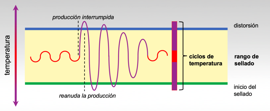 Un rango de sellado adecuado debe permitir ciclos de temperatura de la mordaza de sellado que incluyan el impacto de las interrupciones de producción.